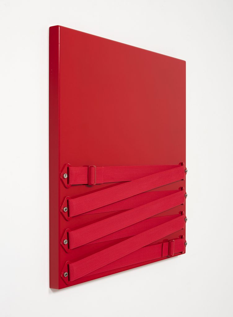 Joshua Saunders. 20/20>, 2016. Enamel on aluminum, nylon straps, stainless steel, 30 x 30 inches