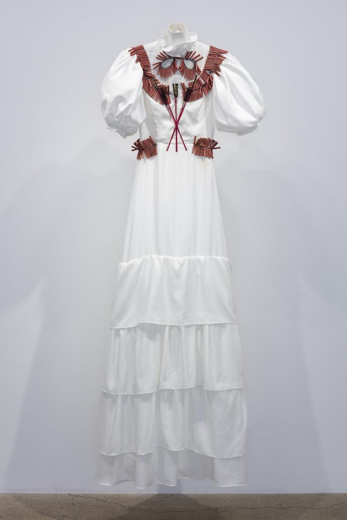 Audrey Wollen. Only Detonate, 2017. Cotton dress and fireworks, 76 x 27 x 8 inches