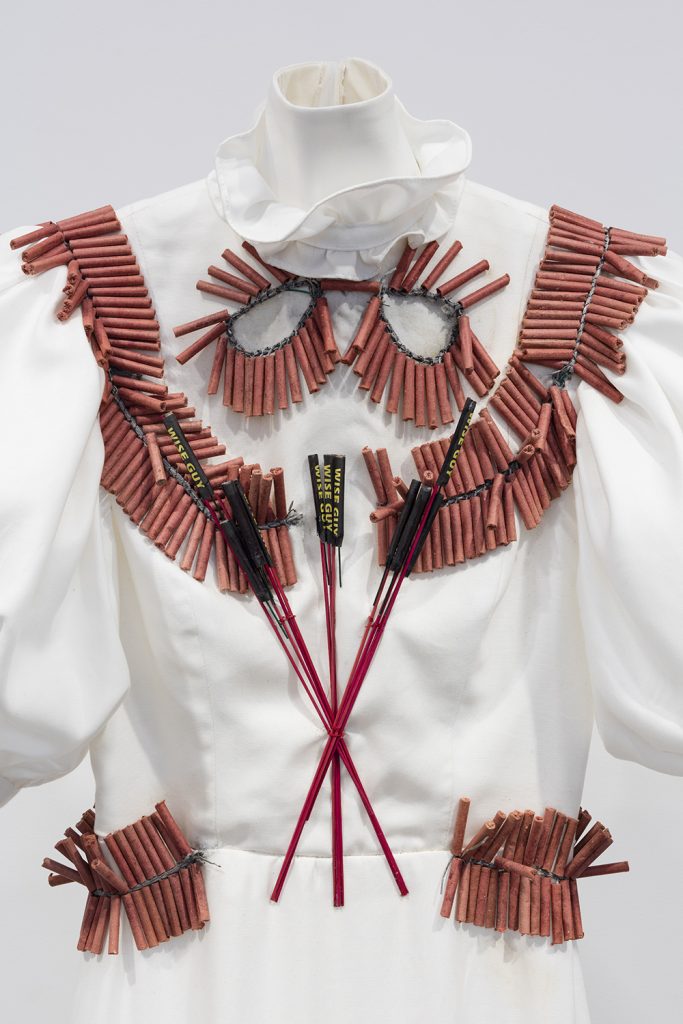 Audrey Wollen. Only Detonate, 2017. Cotton dress and fireworks, 76 x 27 x 8 inches. Detail