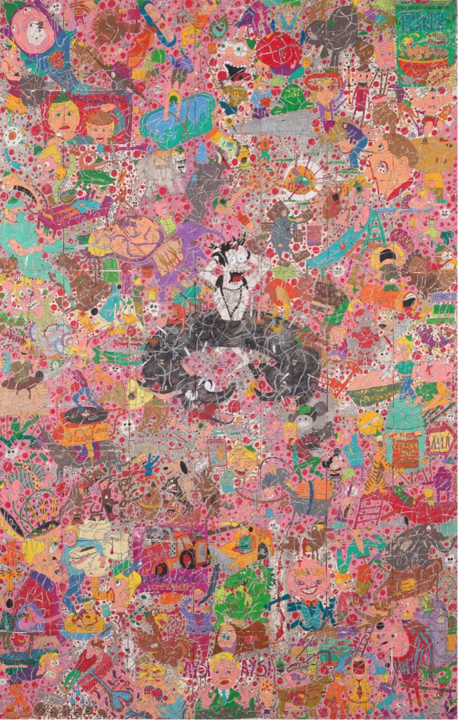 Camilo Restrepo. Rip Currents #5, 2018. Ink, water-soluble wax pastel, tape, newspaper clippings, glue, stickers and saliva on paper. 93 1/4 x 58 inches (236.9 x 147.3 cm)