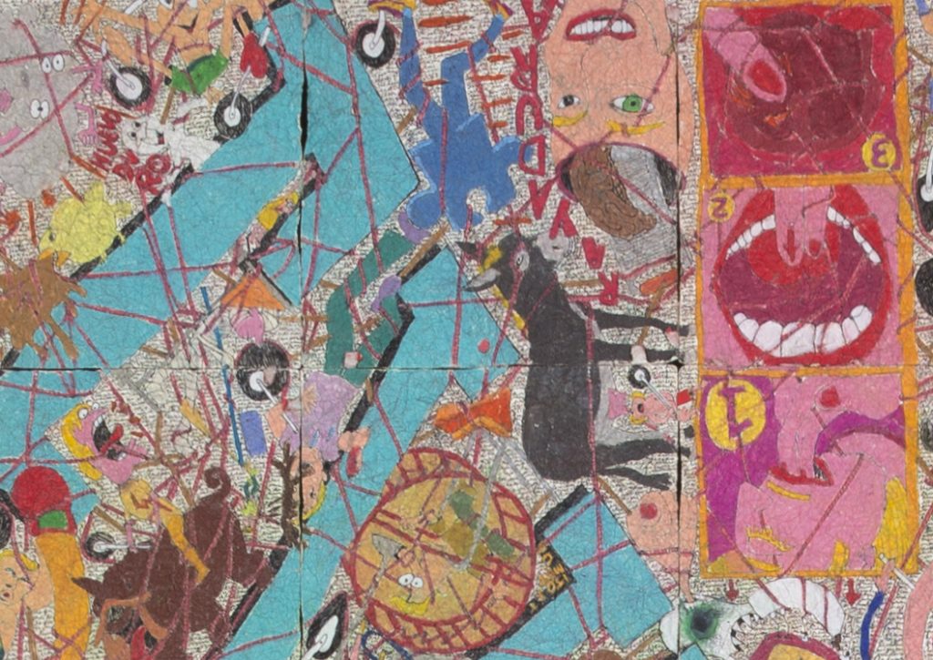 Camilo Restrepo. Tight Rope #8 (Super Sloth), 2015. Ink, water-soluble wax pastel, tape and saliva on paper. 86 x 87 inches (218.4 x 221 cm) (detail)