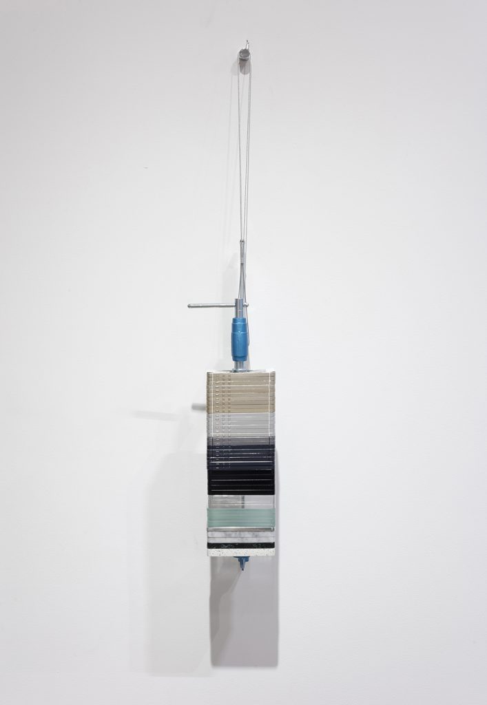 Mariana Murcia. Save As 2, 2017. Clamp, granite, marble aluminum plexiglass cases and Iphone 5s, 24 x 5 x 5 inches (61 x 12.7 x 12.7 cm)