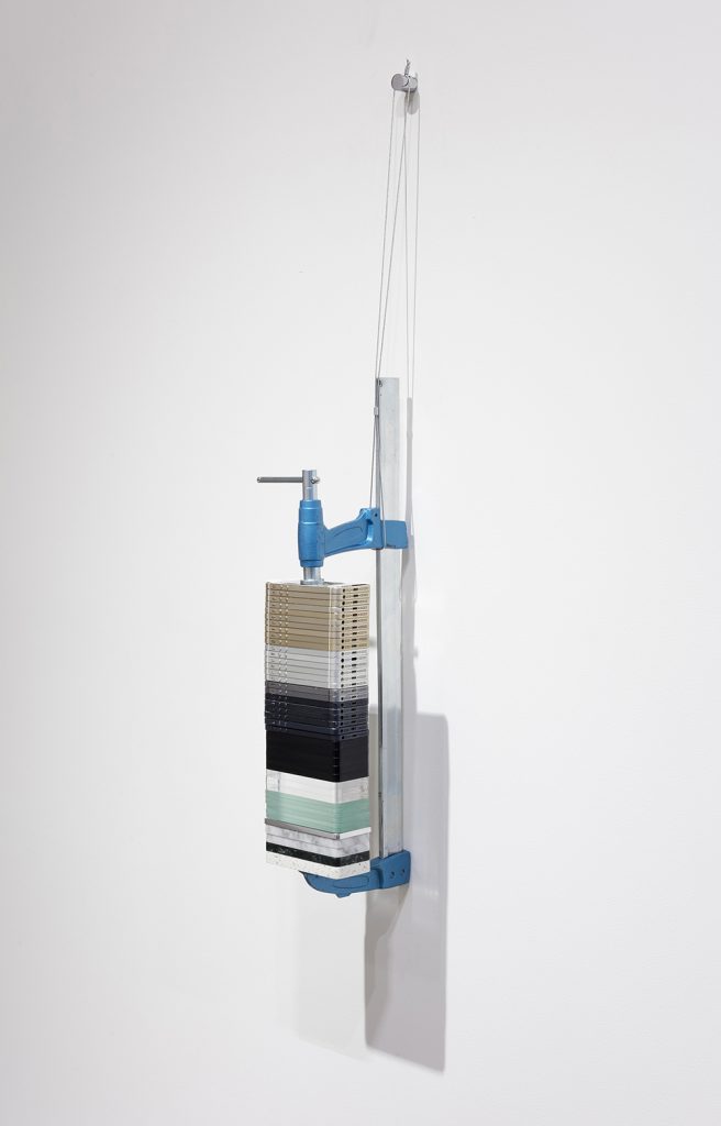 Mariana Murcia. Save As 2, 2017. Clamp, granite, marble aluminum plexiglass cases and Iphone 5s, 24 x 5 x 5 inches (61 x 12.7 x 12.7 cm)