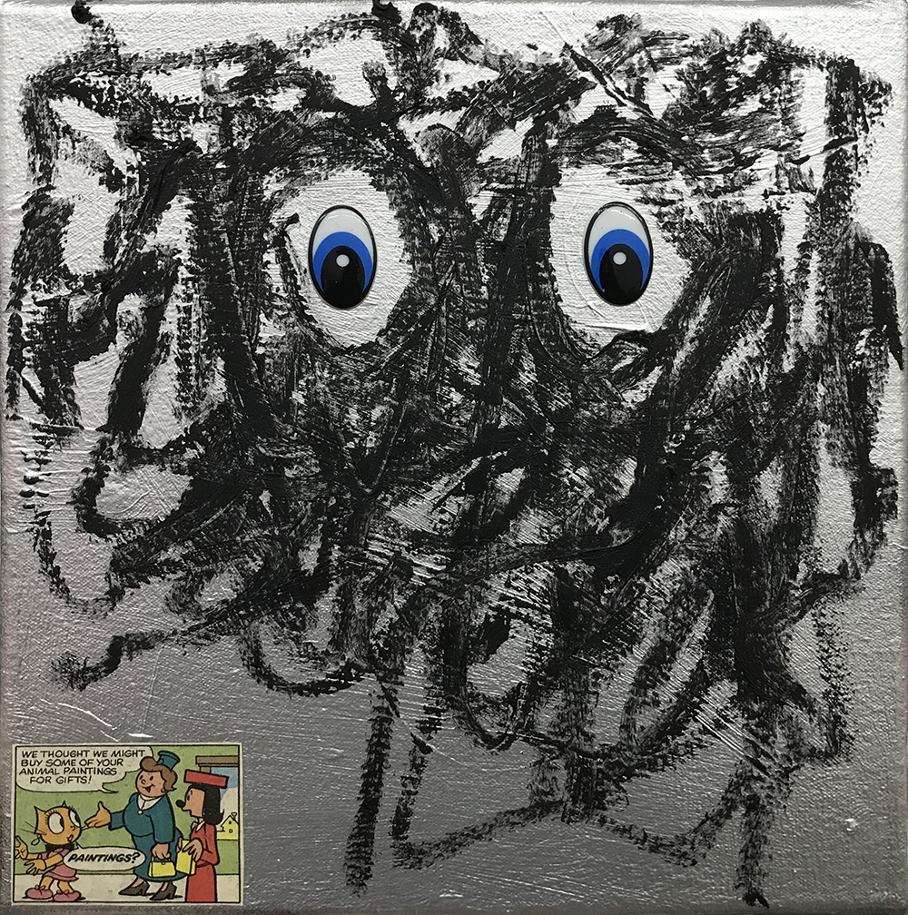 David Leggett. You got static?, 2020. Spray paint, oil bar and collage on canvas, 12 x 12 inches (30.5 x 30.5 cm)