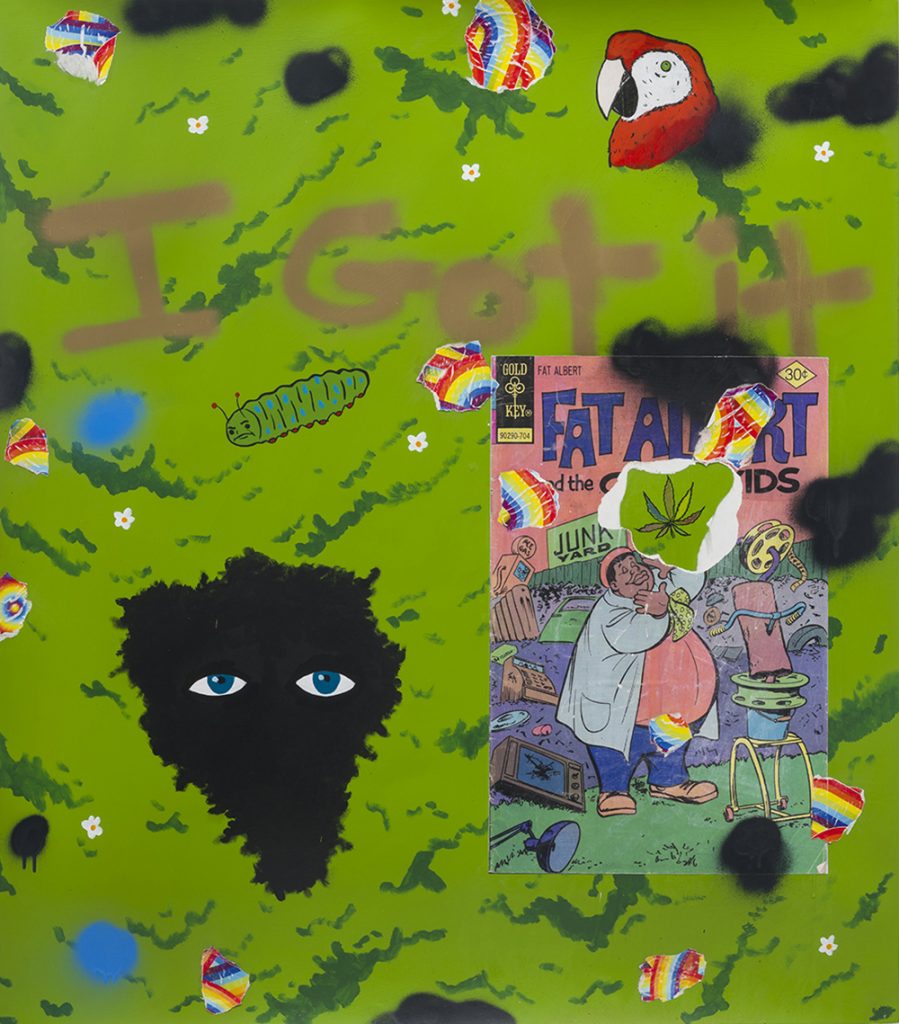 David Leggett. I got it wholesale, 2019. Acrylic, spray paint, color pencil and collage on paper, 48 x 42 inches (121.9 x 106.7 cm)