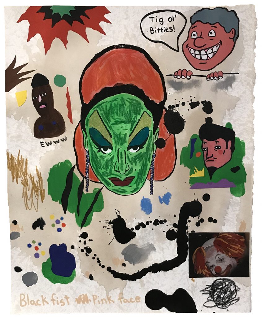 David Leggett. The war makeup isn’t washing off. I bet you were drafted., 2020. Acrylic, screen print, pen, crayon and collage on paper, 20 x 16 inches (50.8 x 40.6 cm)