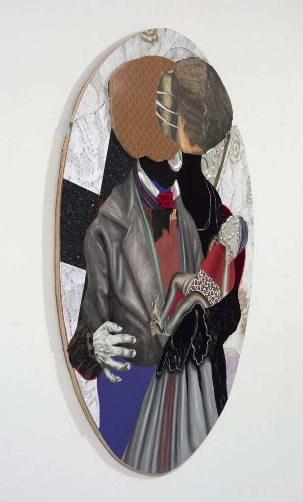David Shrobe. At A Crossroads, 2020. Oil, acrylic and graphite on paper, steel, wood, flocking, wool tweed, faux suede, vinyl, fabric, linen and bookbinding cloth mounted on carved wood, 77 x 55 x 2 inches (195.6 x 139.7 x 5.1 cm) Detail
