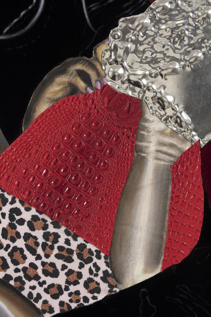 David Shrobe. At A Crossroads, 2020. Oil, acrylic and graphite on paper, steel, wood, flocking, wool tweed, faux suede, vinyl, fabric, linen and bookbinding cloth mounted on carved wood, 77 x 55 x 2 inches (195.6 x 139.7 x 5.1 cm) Detail