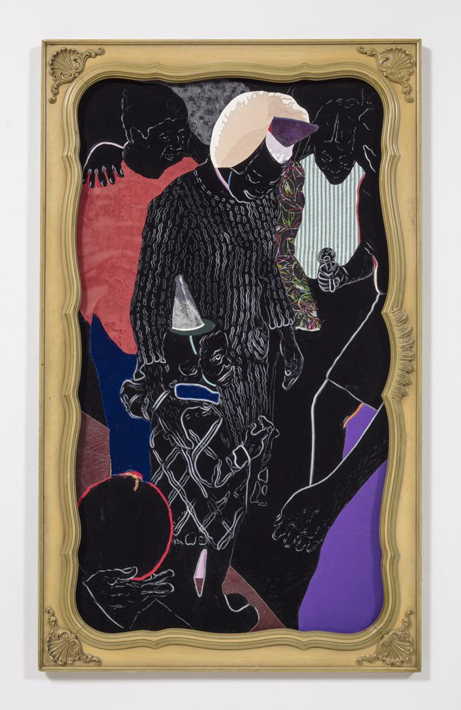 David Shrobe. My Corner, 2020. Oil on paper and canvas, acrylic on flocking, linen, suede and leather mounted on wood panel and set in found wood frame, 63 x 38 x 2 inches (160 x 96.5 x 5.1 cm)