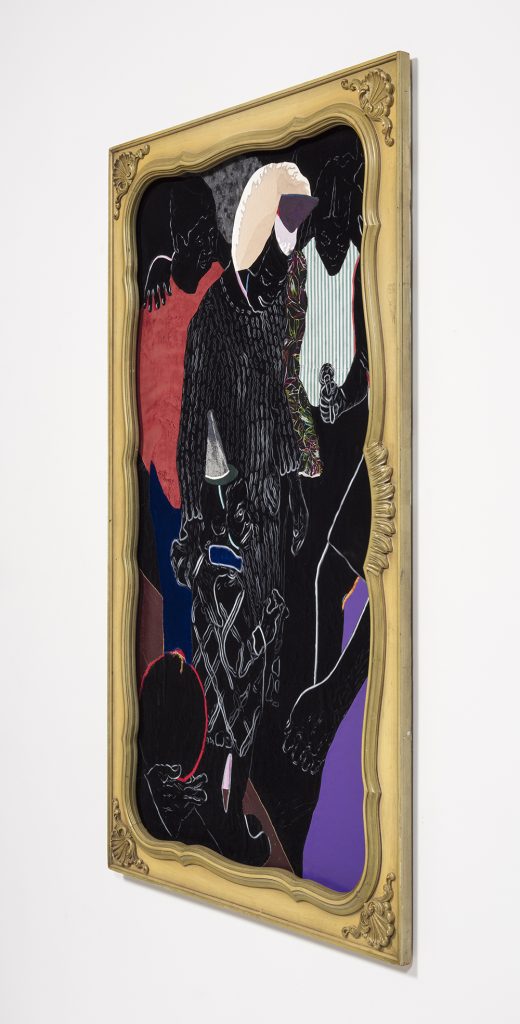 David Shrobe. My Corner, 2020. Oil on paper and canvas, acrylic on flocking, linen, suede and leather mounted on wood panel and set in found wood frame, 63 x 38 x 2 inches (160 x 96.5 x 5.1 cm) Detail