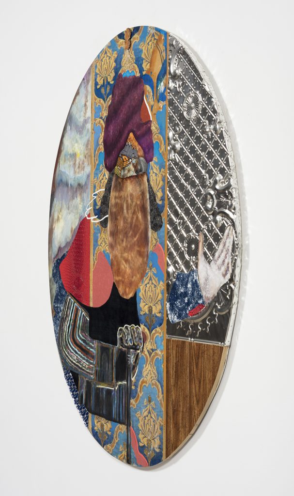 David Shrobe. Walk the Air, 2020. Oil, acrylic, ink, steel, tin, gold leaf, wood, canvas, bookbinding cloth, sandpaper, faux leather and plastic merchandise bag mounted on wood, 63 1/2 x 48 1/2 x 1 3/4 inches (161.3 x 123.2 x 4.4 cm) Detail