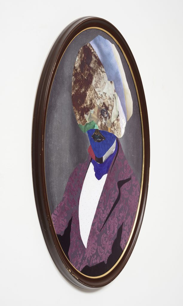 David Shrobe. Transitions, 2020. Oil, acrylic and ink on canvas and paper, red sandpaper, flocking, vinyl and photo print on canvas in found wood frame with gold leaf behind glass, 40 x 30 x 2 inches (101.6 x 76.2 x 5.1 cm) Detail