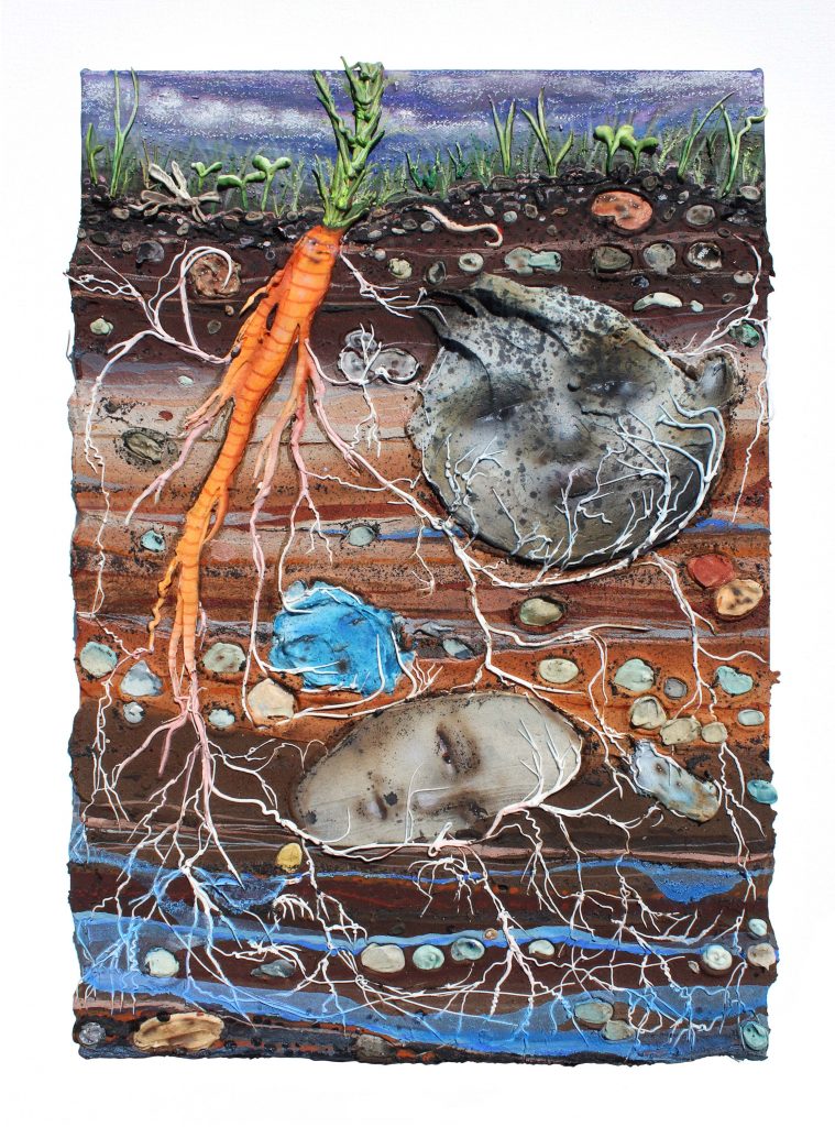 2020. Acrylic, watercolor, vinyl paint, sand, pumice, oil stick and oil pastel on canvas. 16 x 11 1/4 x 2 inches (40.6 x 28.6 x 5.1 cm)