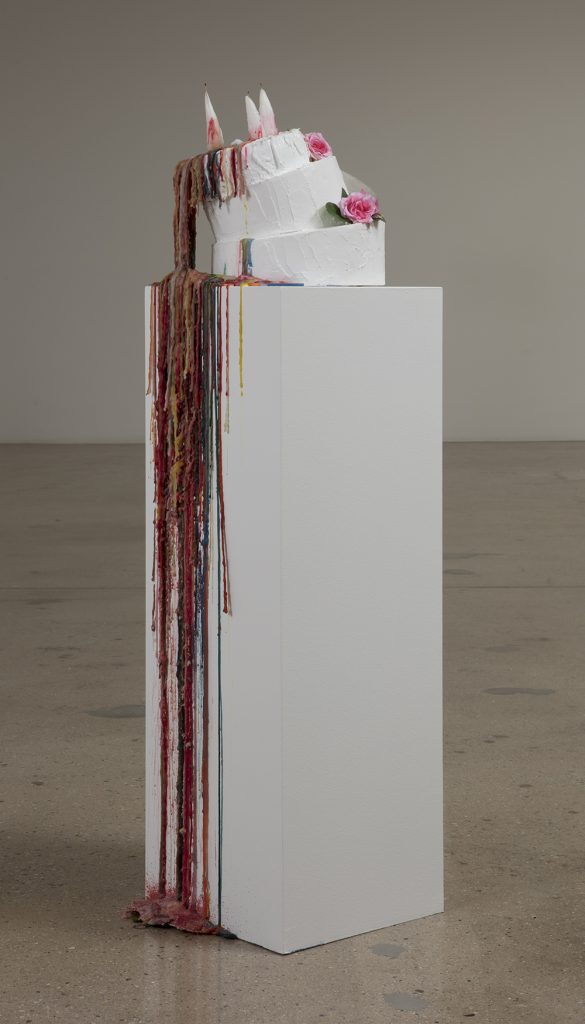 Addie Wagenknecht. Waiting for Mr. Right, 2017. Polystyrene, silicone, alabaster, drip candles and artificial flowers, 47 x 12 1/2 x 11 inches