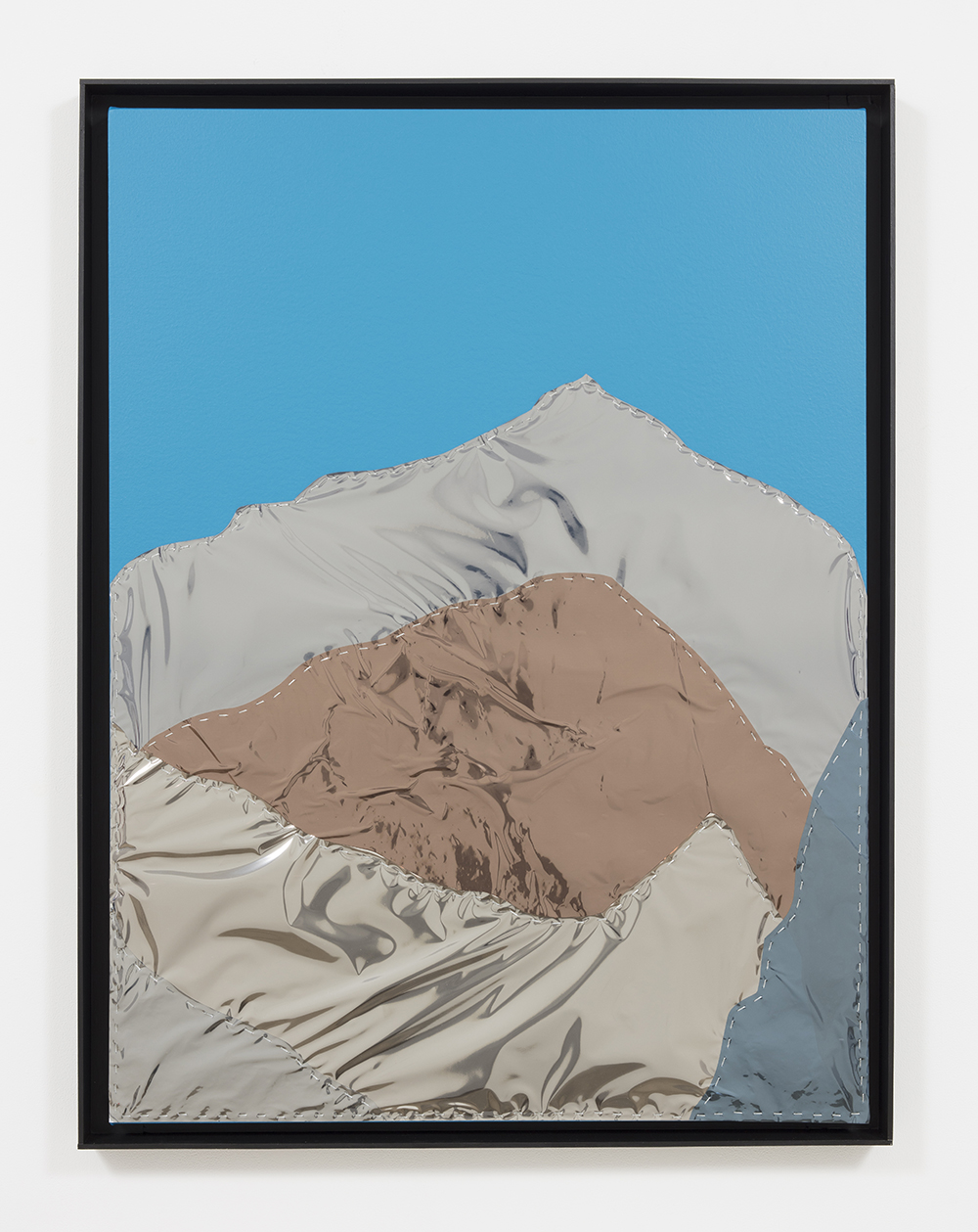 John Knuth. Distorted Landscape #7, 2018. UV film and staples on acrylic on canvas on panel. 48 x 36 inches (121.9 x 91.4 cm)