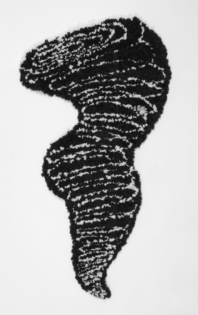 Hannah Epstein. Twister, 2019. Wool, acrylic, polyester, burlap and found toy, 70 x 37 inches (177.8 x 94 cm)
