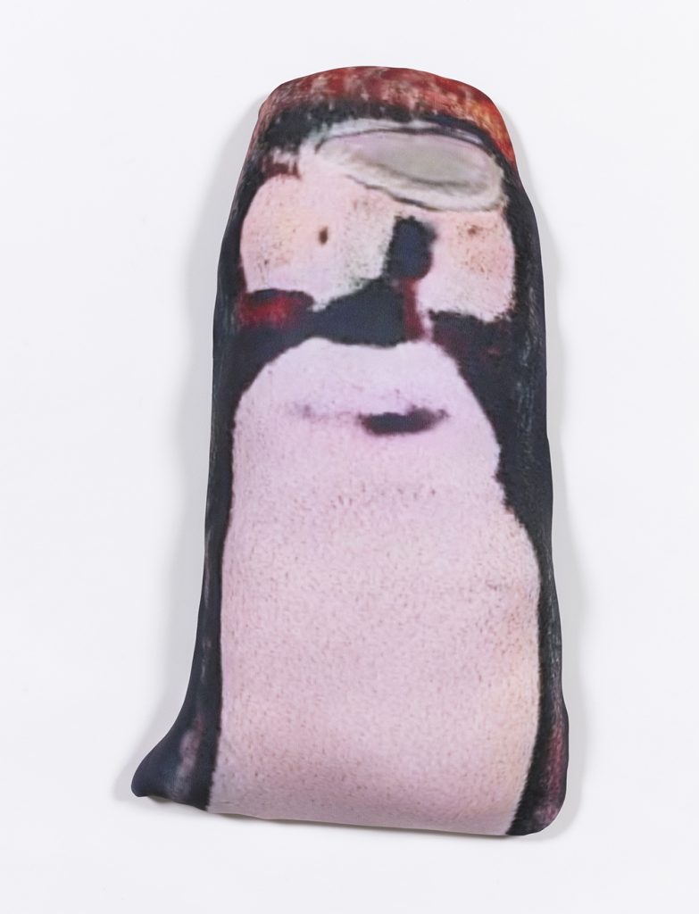 Hannah Epstein. Mutant Penguin, 2020. Digital print on lycra; polyfill and wood, 22 x 12 x 3 inches (55.9 x 30.5 x 7.6 cm)