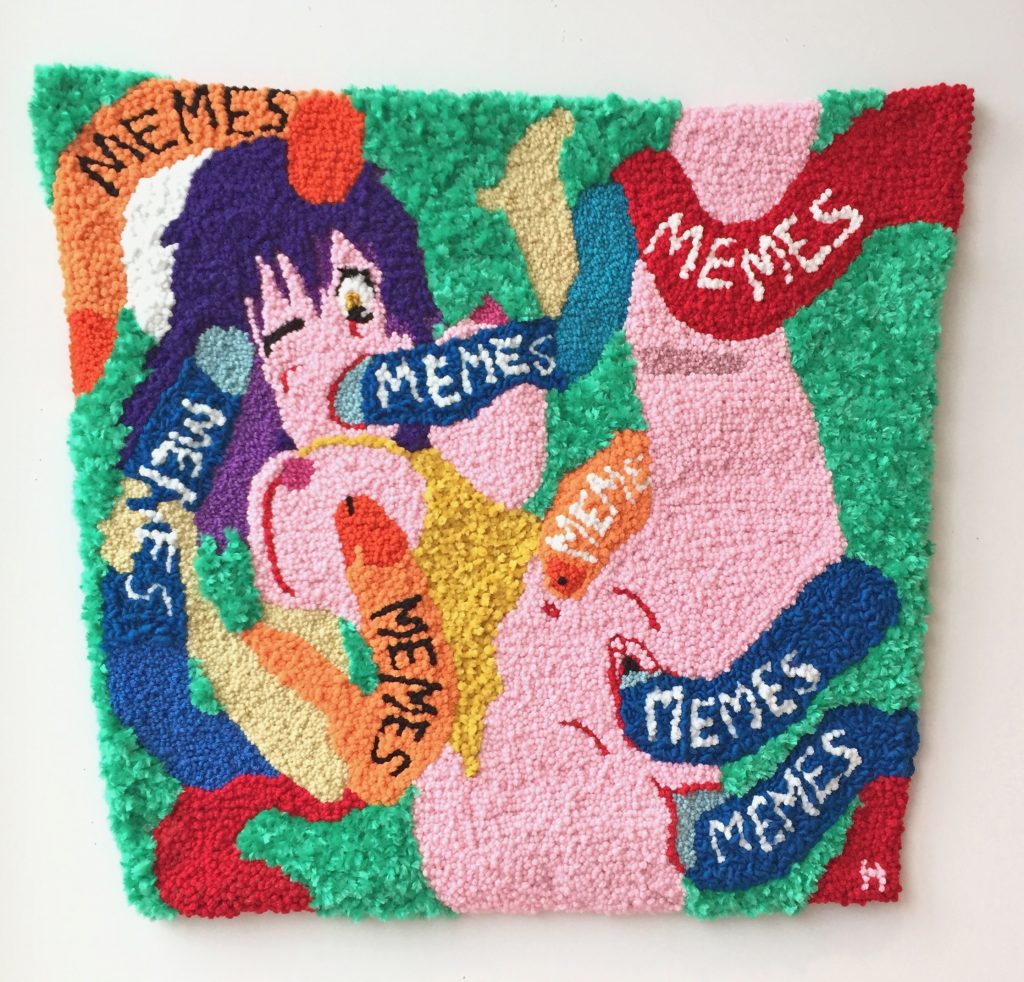 Hannah Epstein. The Dream of the Memelord’s Wife, 2017. Wool, acrylic, polyester and burlap. 30 x 32 inches (76.2 x 81.3 cm)