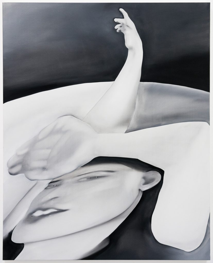 Jingze Du. At a Friend’s House, 2020. Oil on linen, 59 x 47 1/4 inches (150 x 120 cm)