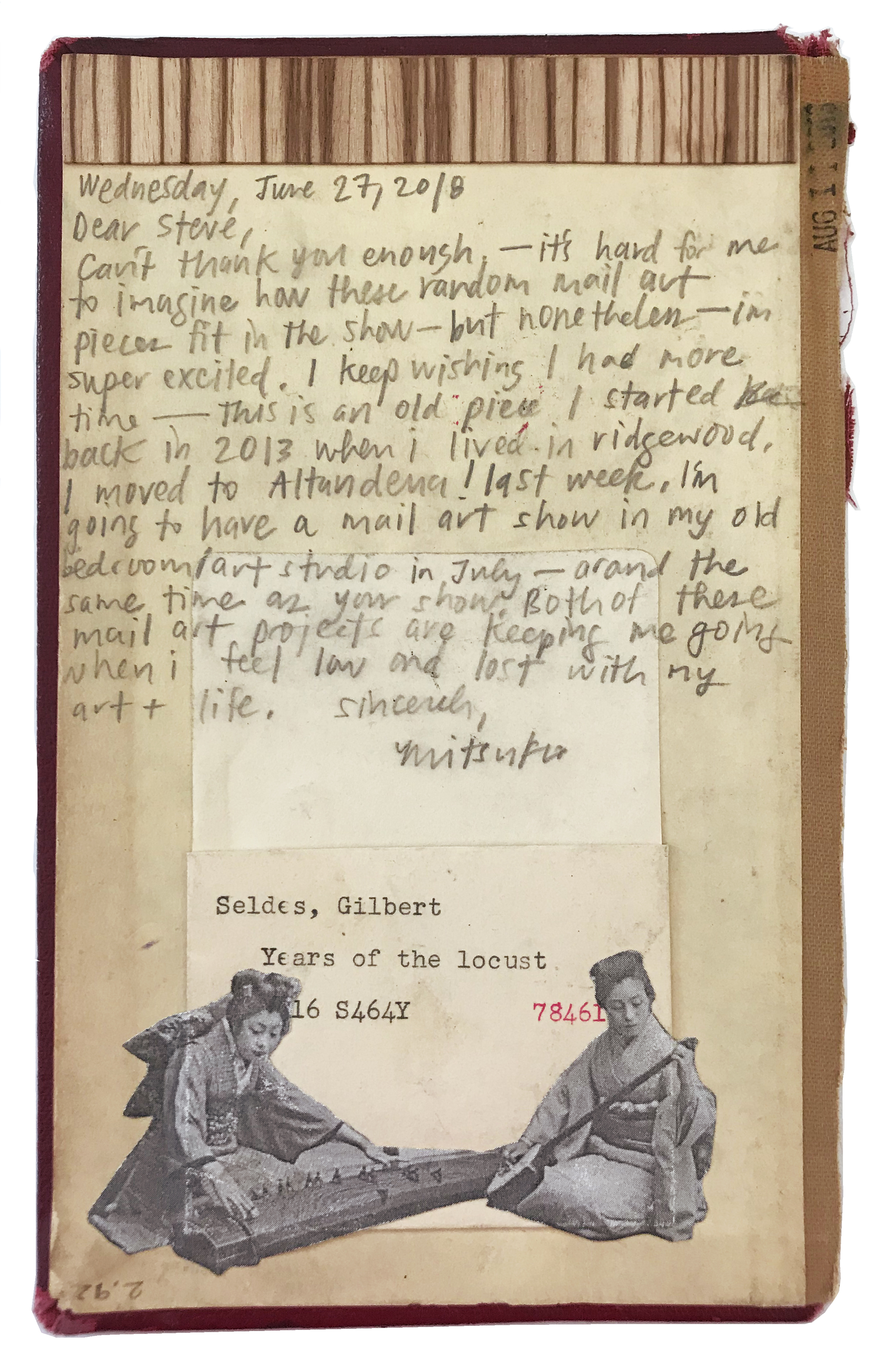 Mitsuko Brooks. Mailed to Steve Turner, June 22, 2018, 2018. Pencil, ink, postage stamps, and paper collaged onto detached book cover 8 ½ x 5 ½ inches (21.6 x 14 cm)