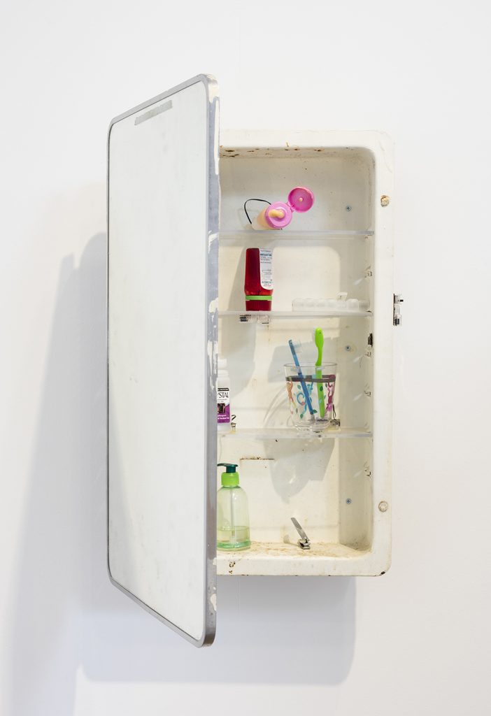 Tim Hawkinson. World Clock, 2012. Medicine cabinet, ace bandage, lotion bottle, prescription medicine bottle, dental floss, deodorant, toothbrushes, plastic cup, pump soap bottle, nail clipper and clock motors, 25 1/2 x 16 x 21 inches (64.8 x 40.6 x 53.3 cm)