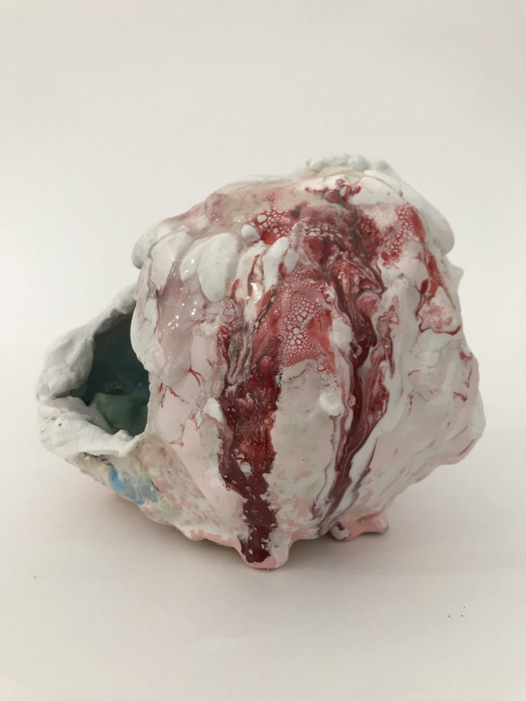 Brian Rochefort. Skull (red, white, black), 2017. Terra cotta, glaze and glass fragments, 7 x 5 x 7 inches (17.8 x 12.7 x 17.8 cm)