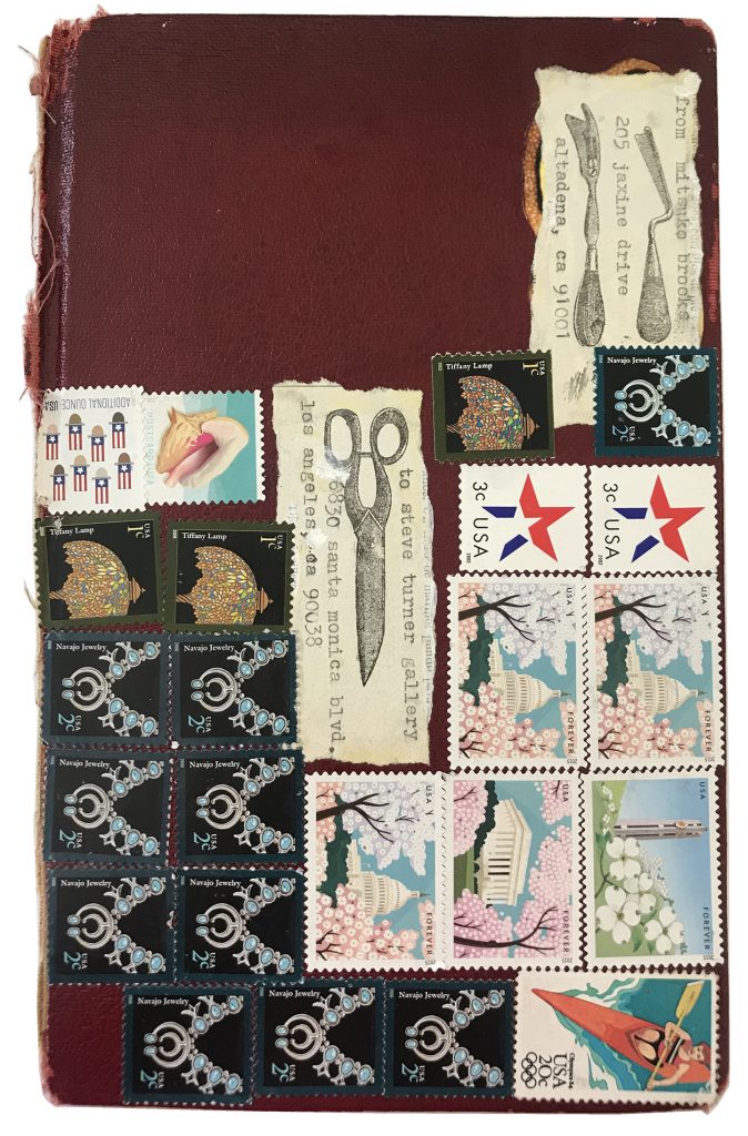 Mitsuko Brooks. Untitled, 2018. Pencil, postal stamps, glue and collage on torn book cover, 8.5 x 5.5 inches (21.6 x 14 cm)