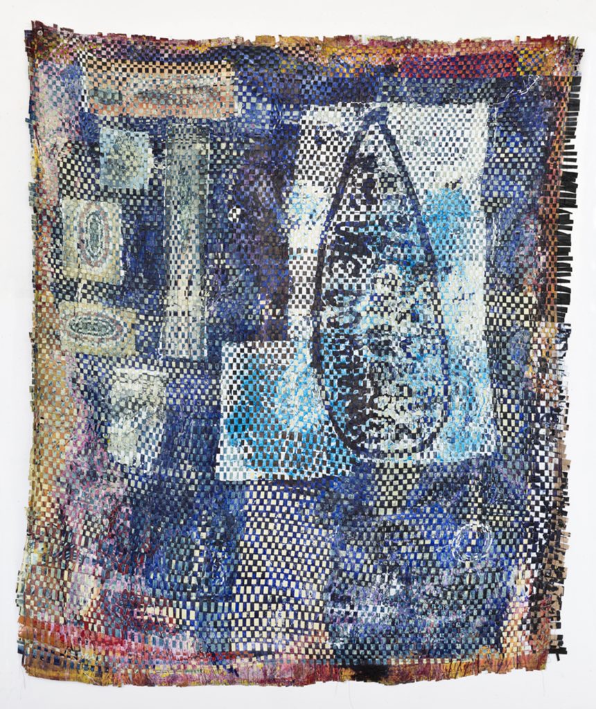 Kyle Goldbach. Remainder (111117311PM), 2017. Oil, acrylic, threads and photographs on rip resistant billboard vinyl, 90 x 78 inches (228.6 x 198.1 cm)