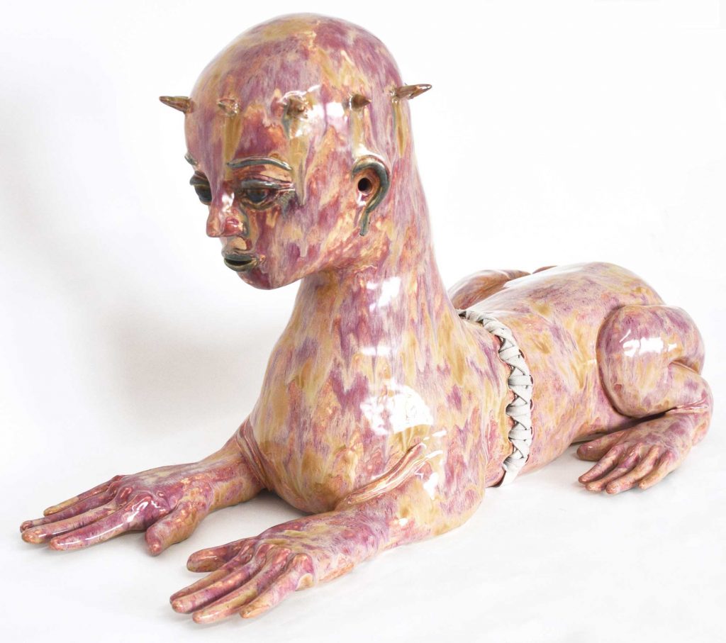 Becky Tucker. Vault, 2024. Glazed stoneware, faux suede dyed with indigo, 16 1/2 x 31 1/2 x 13 inches (42 x 80 x 33 cm)