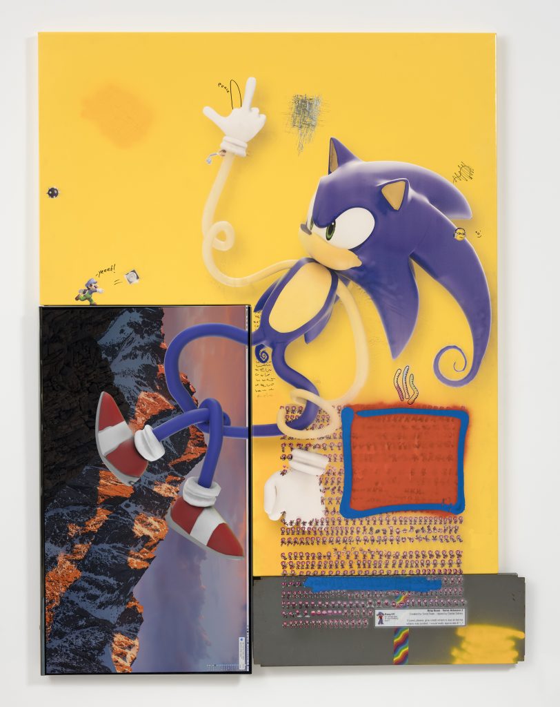 Yung Jake. sonic (and amy rose and spike mario), 2017. UV print, spray paint, stickers, tape and ink on powder coated steel, found metal and monitor, 84 x 63 3/4 inches