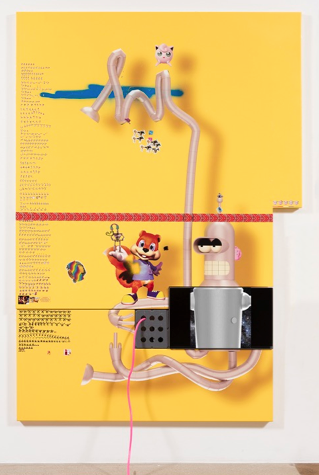 Yung Jake. bender (w conker, iron giant and jiggly puff and earthworm jim), 2017. UV print, spray paint, stickers, tape and ink on powder coated steel, found metal and monitor, 96 x 67 inches