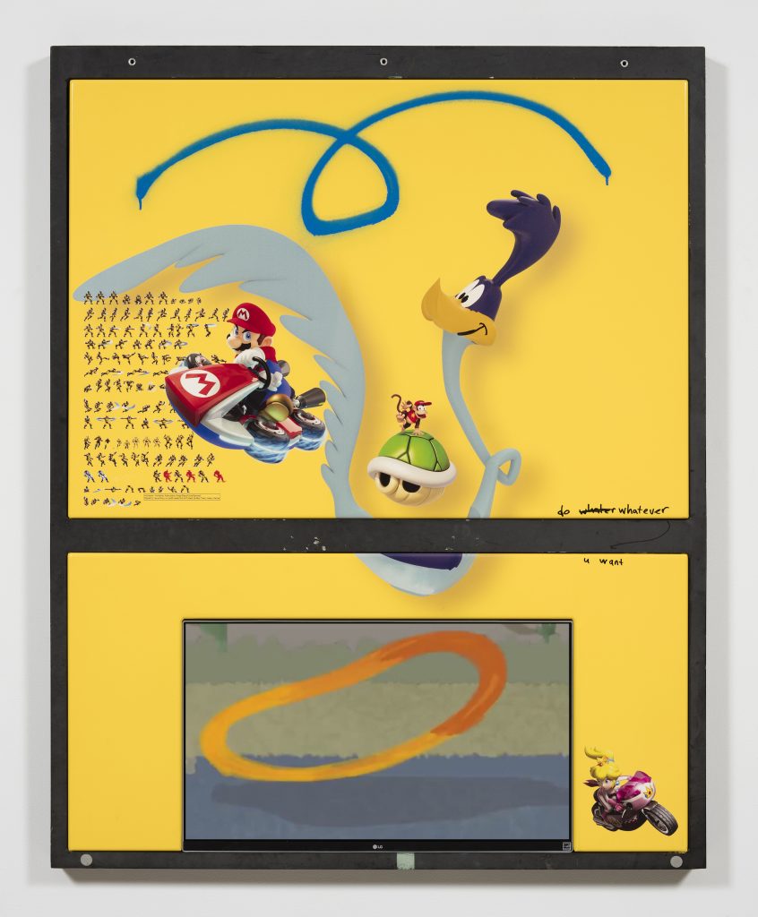 Yung Jake. roadrunner (w mario, princess peach, diddy kong and wolverine), 2017. UV print, spray paint, tape and ink on powder coated steel, found metal and monitor, 51 x 40 1/2 inches