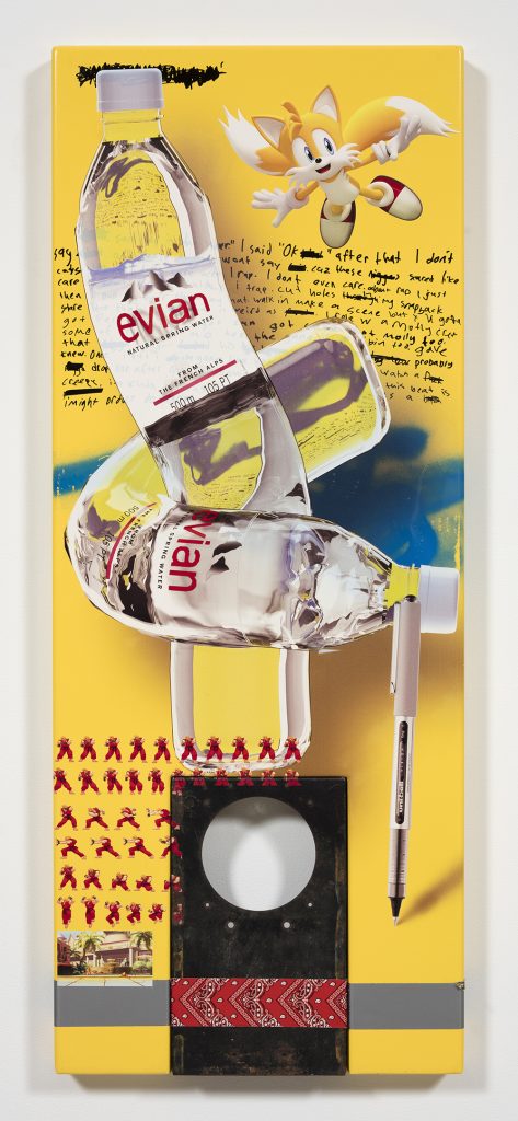 Yung Jake. tails (w ken masters), 2017. UV print, spray paint, tape and ink on powder coated steel and found metal, 42 x 17 inches