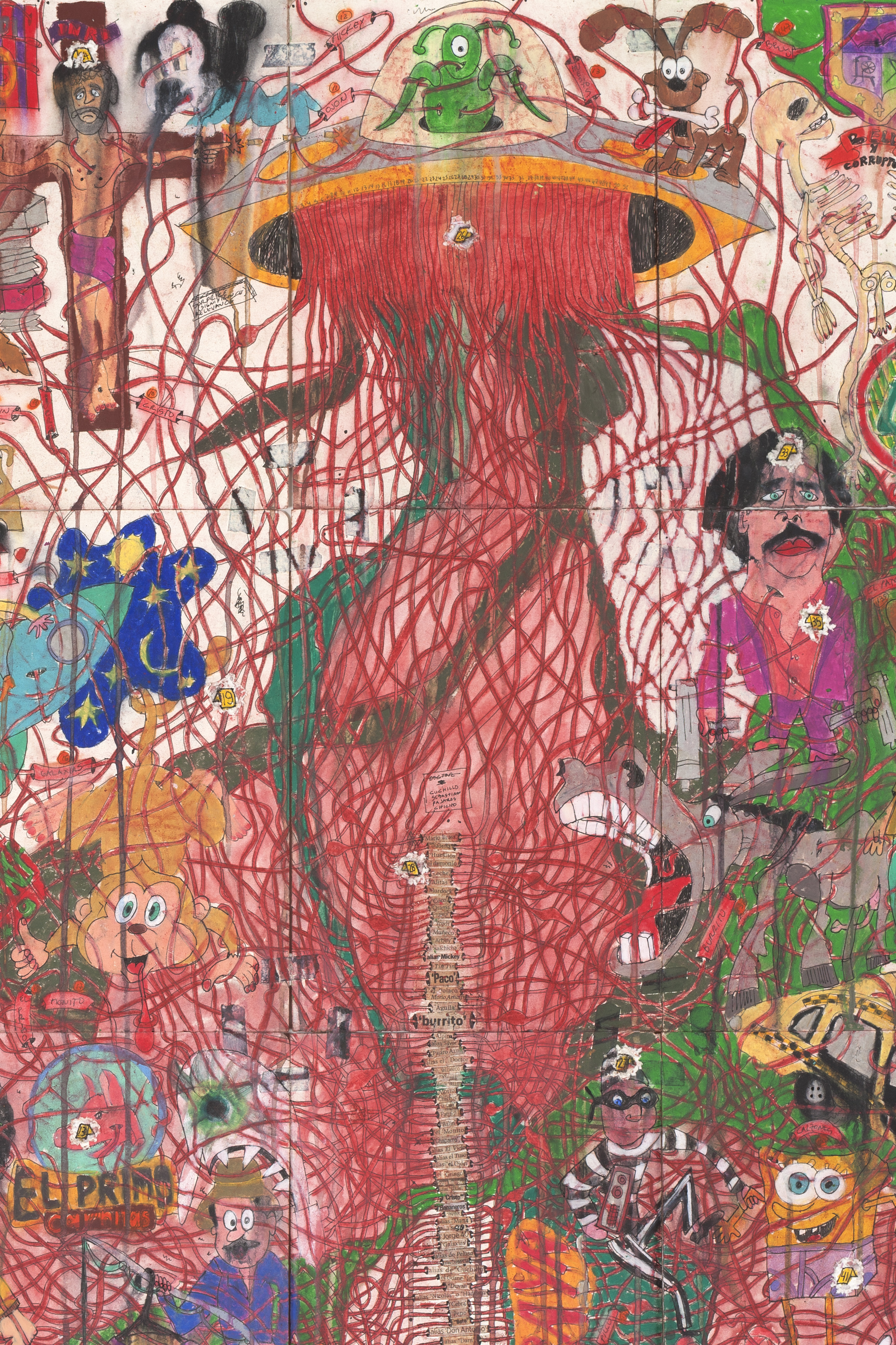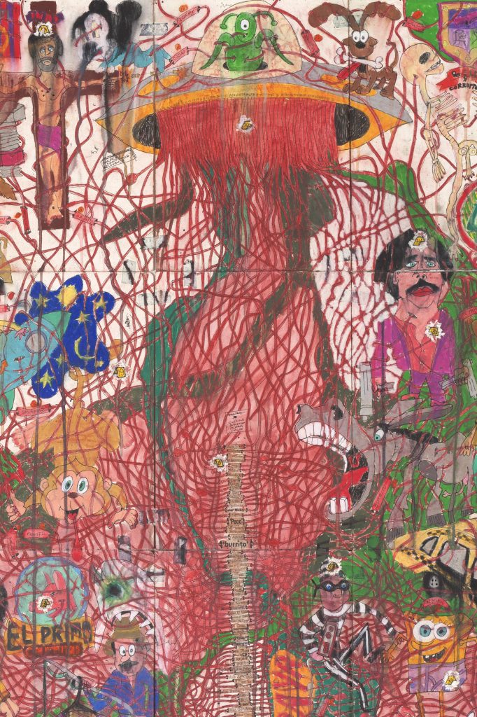 Camilo Restrepo. A Land Reform 9, 2016. Ink, water-soluble wax pastel, tape, stickers, newspaper clippings, glue and saliva on paper. 70 x 74 1/2 inches (177.8 x 189.2 cm) (detail)