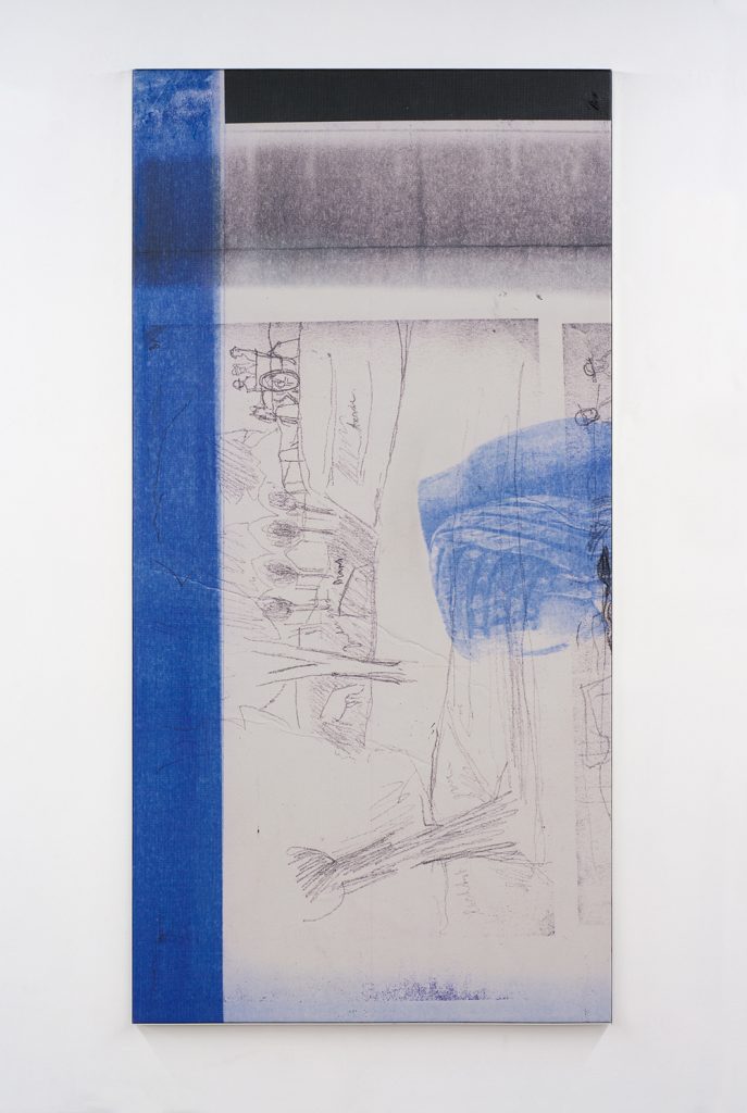Manor Grunewald. Untitled (Wormhole_01), 2018. UV print on polyester mesh fabric, oil, acrylic and spray paint on canvas. 78 3/4 x 39 3/8 inches (200 x 100 cm)