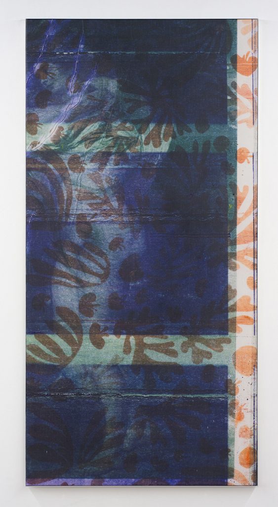 Manor Grunewald. Untitled (Wormhole_03), 2018. UV print on polyester mesh fabric, oil, acrylic and spray paint on canvas. 78 3/4 x 39 3/8 inches (200 x 100 cm)