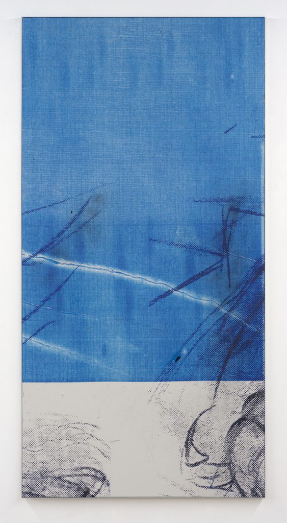 Manor Grunewald. Untitled (Wormhole_07), 2018. UV print on polyester mesh fabric, oil, acrylic and spray paint on canvas. 78 3/4 x 39 3/8 inches (200 x 100 cm)
