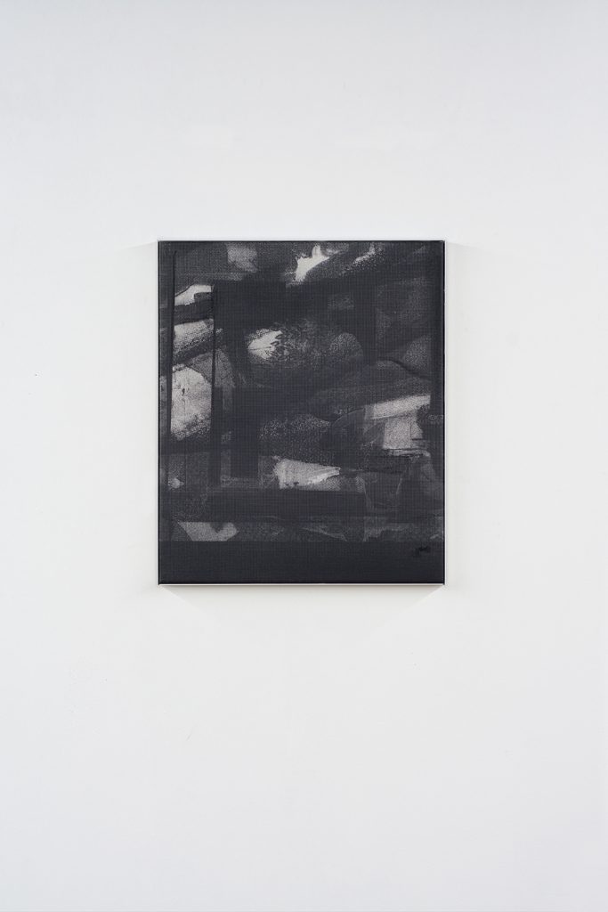 Manor Grunewald. Untitled (Wormhole_13), 2018. UV print on polyester mesh fabric, oil, acrylic and spray paint on canvas. 23 5/8 x 19 5/8 inches (60 x 50 cm)