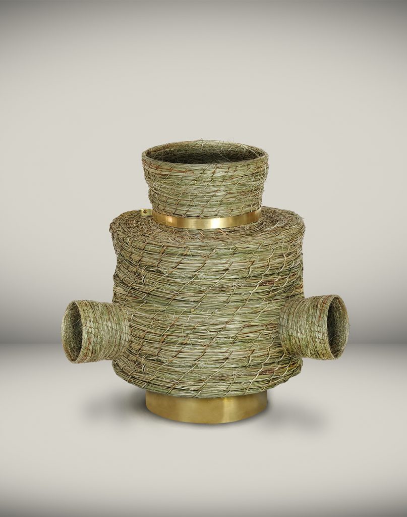 Eugenia Mendoza. Basket Connection II, 2020. Phormium and bronze, 10 1/4 x 10 5/8 x 10 5/8 inches (26 x 27 x 27 cm)