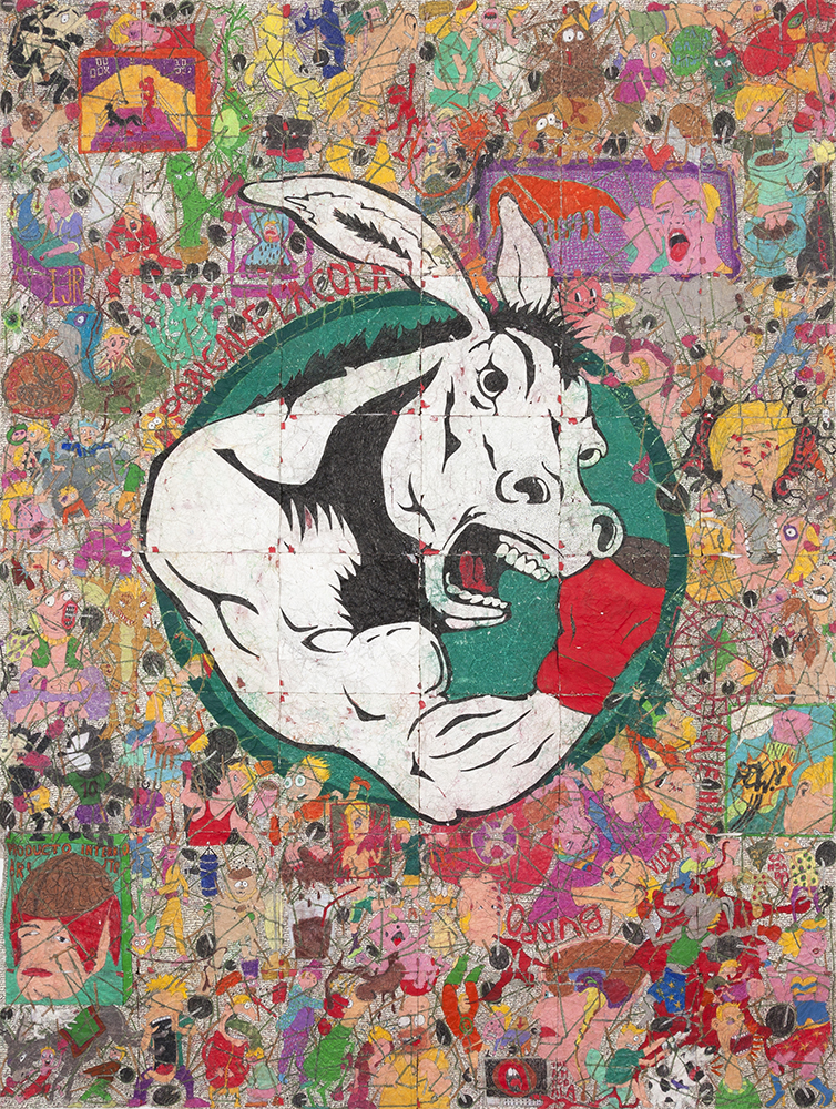 Camilo Restrepo. Tight Rope #6 (El Burro), 2015. Ink, water-soluble wax pastel, tape and saliva on paper. 63 x 47 inches (160 x 119.4 cm)