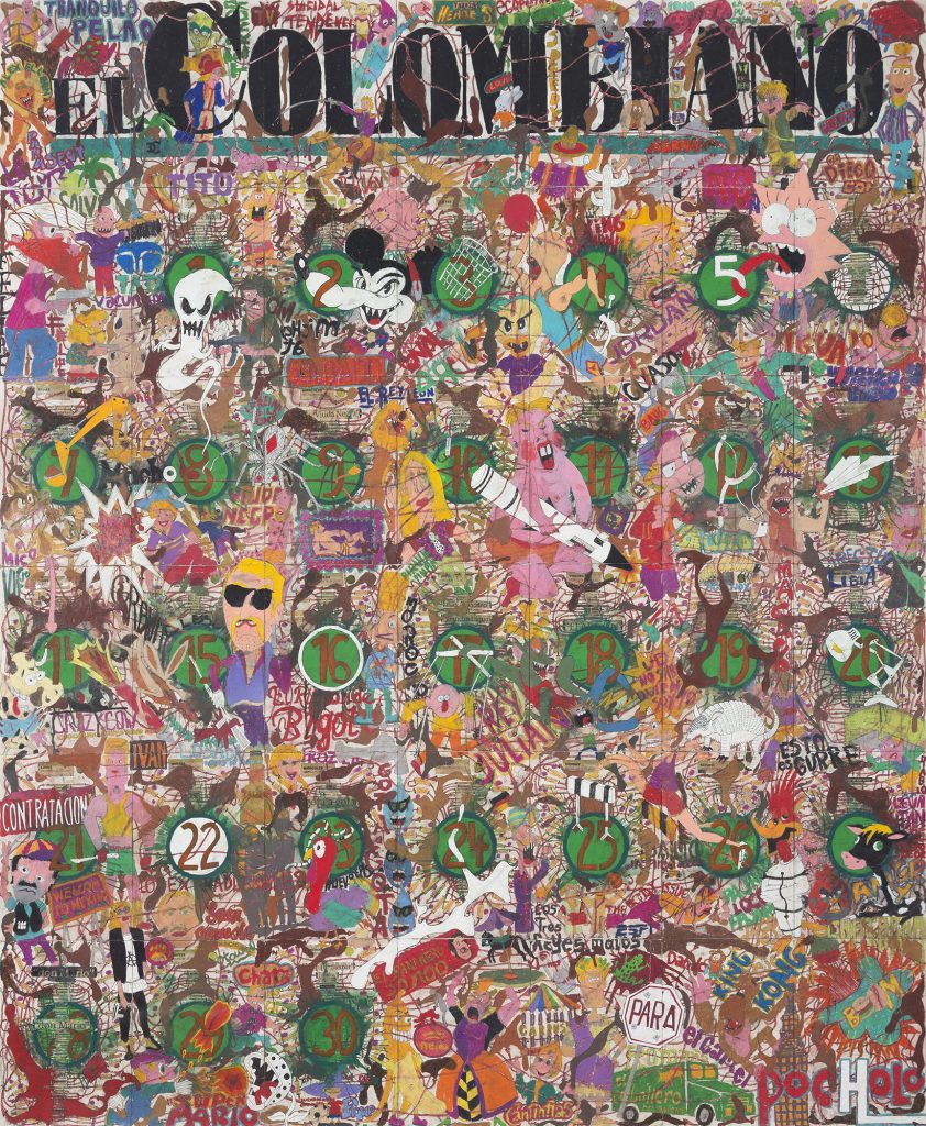 Camilo Restrepo. Any September is a Black September Down Here #2 (El Colombiano), 2016. Ink, water-soluble was pastel, tape, glue, newspaper clippings, lacquer and saliva on paper, 70 x 58 inches (177.8 x 147.3 cm)