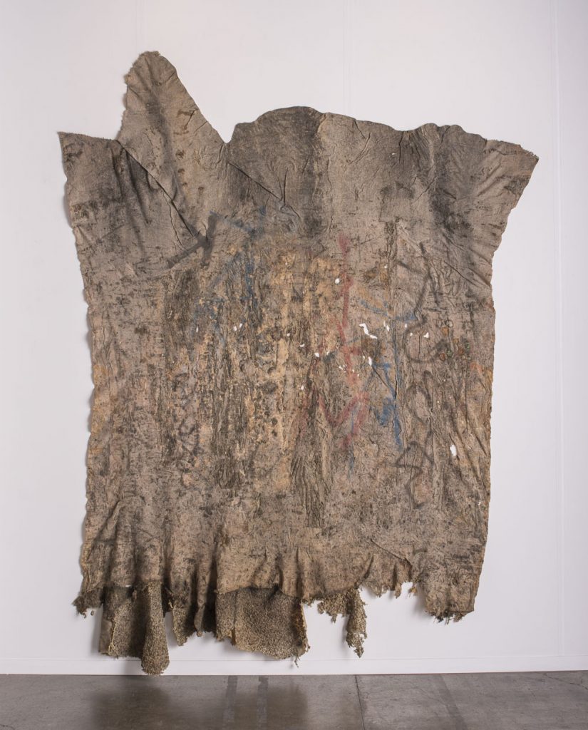 Rubber, tree and paint residue, found chewing gum, pine gum and found debris on cotton.