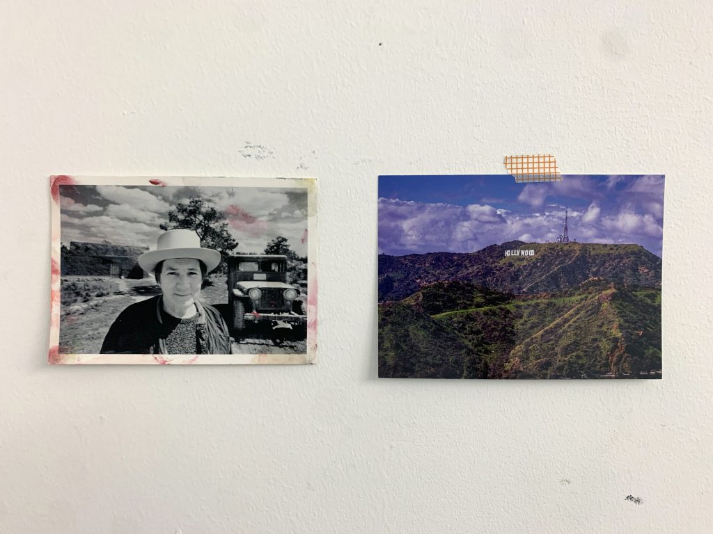 Agnes Martin and Hollywood Sign. Postcards on the wall at Hannah Wilson’s studio, Glasgow, 2024